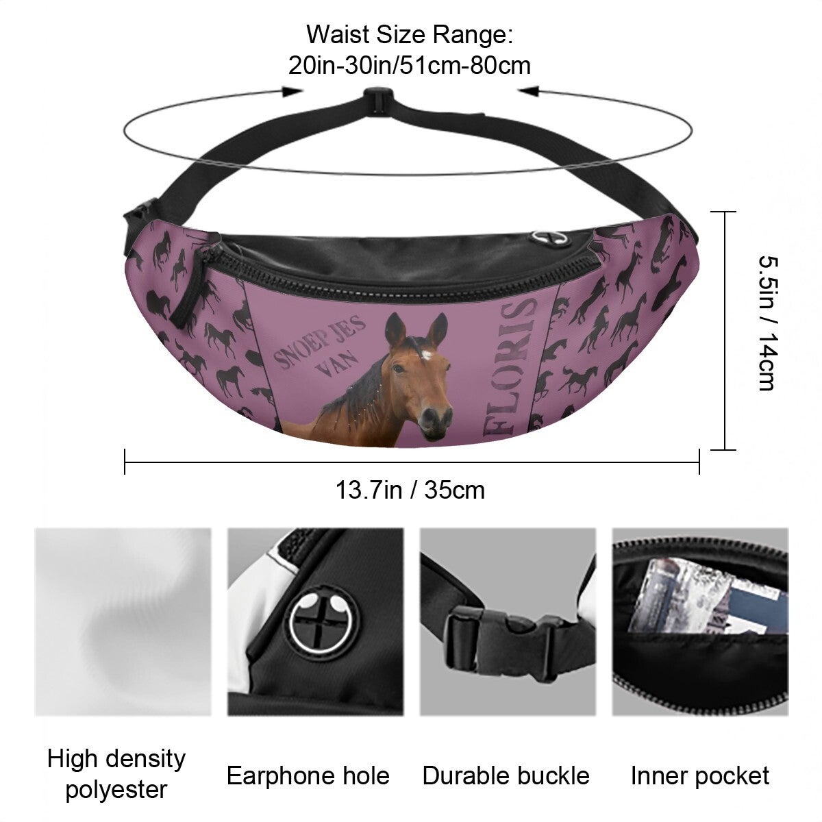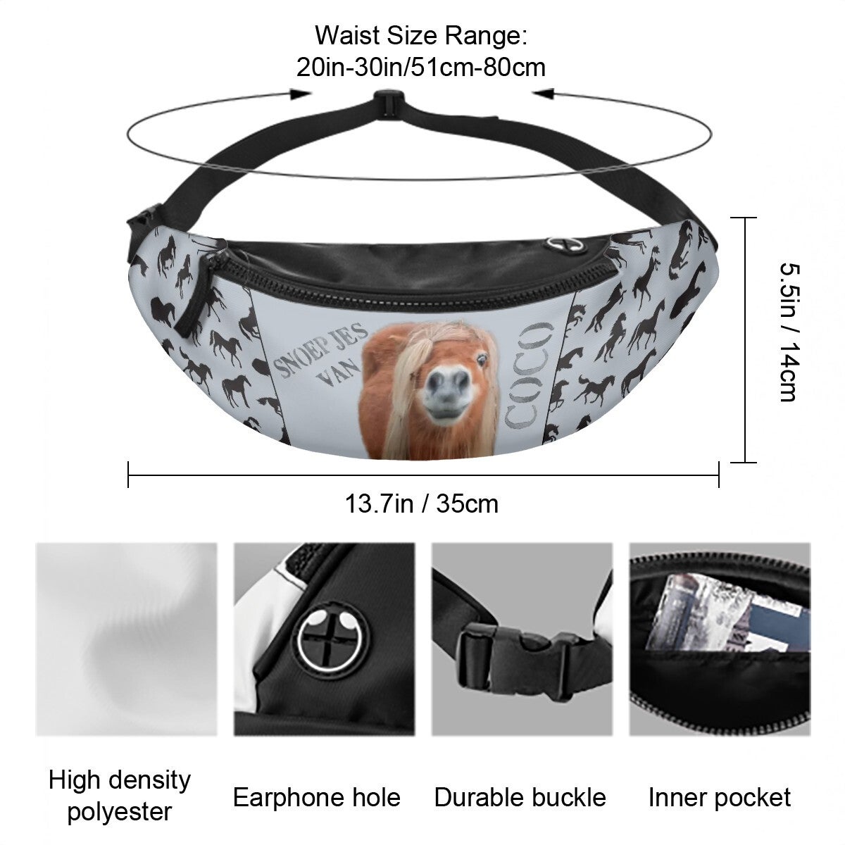 De omtrek is 51 tot 80 centimeter. Heb je een grotere omtrek nodig, kies dan voor ons andere heuptasje.
